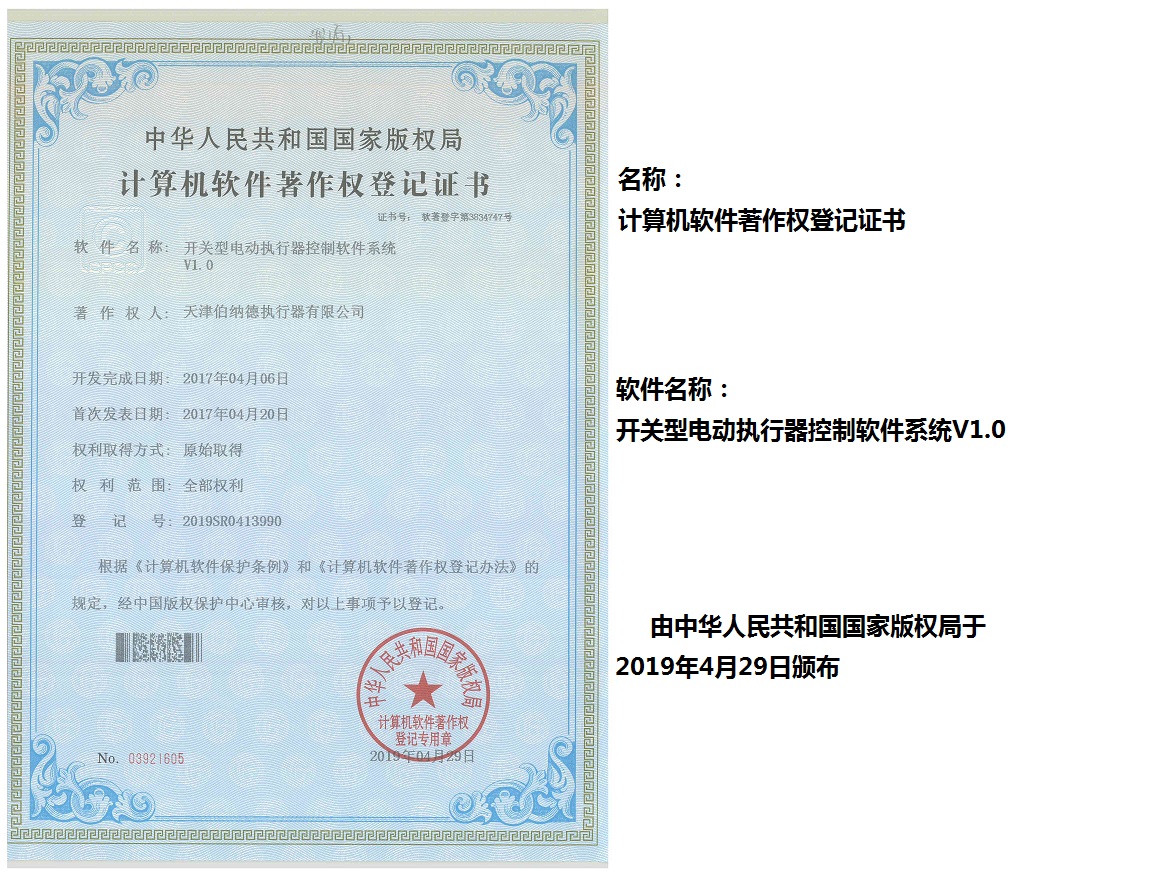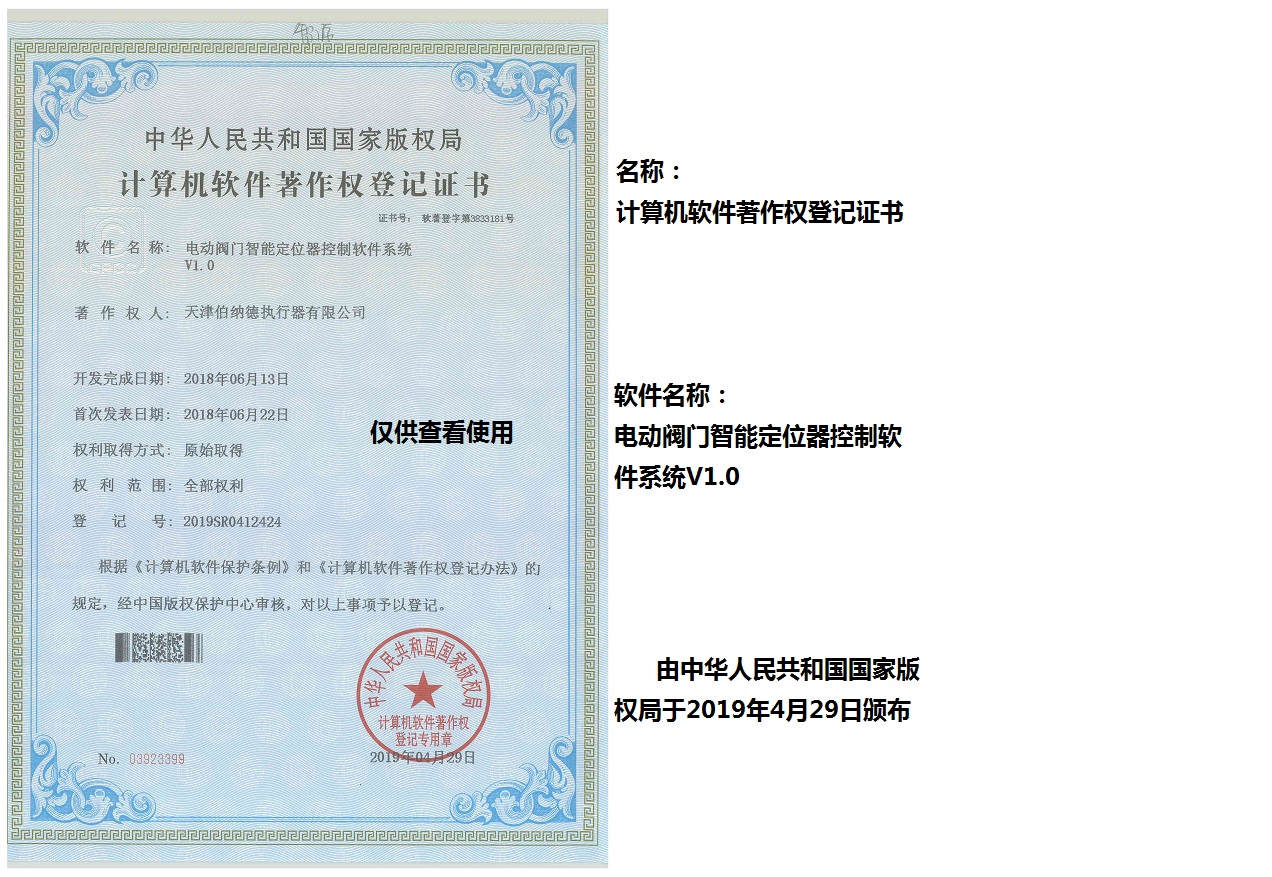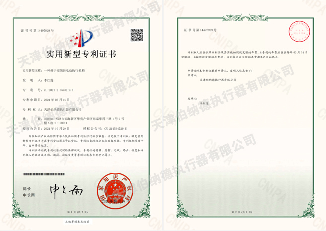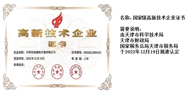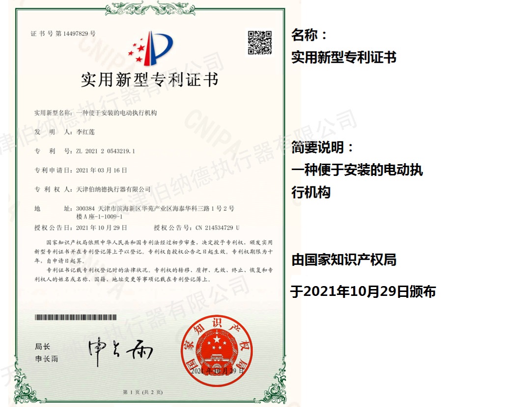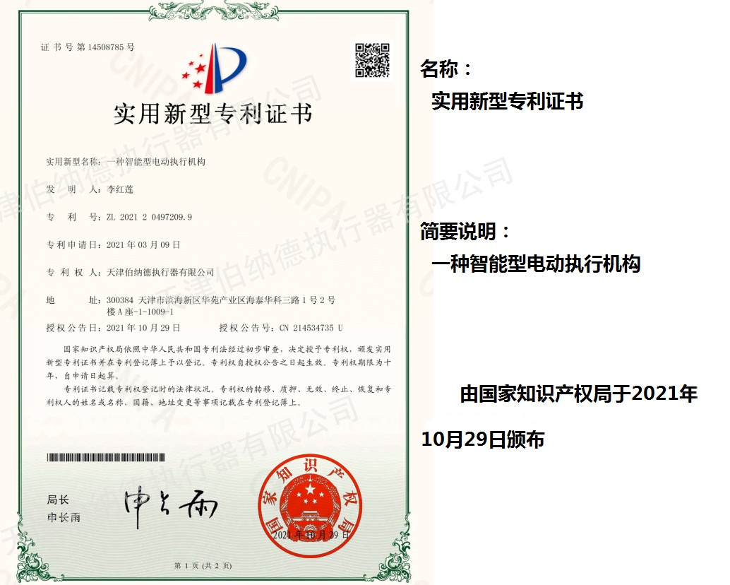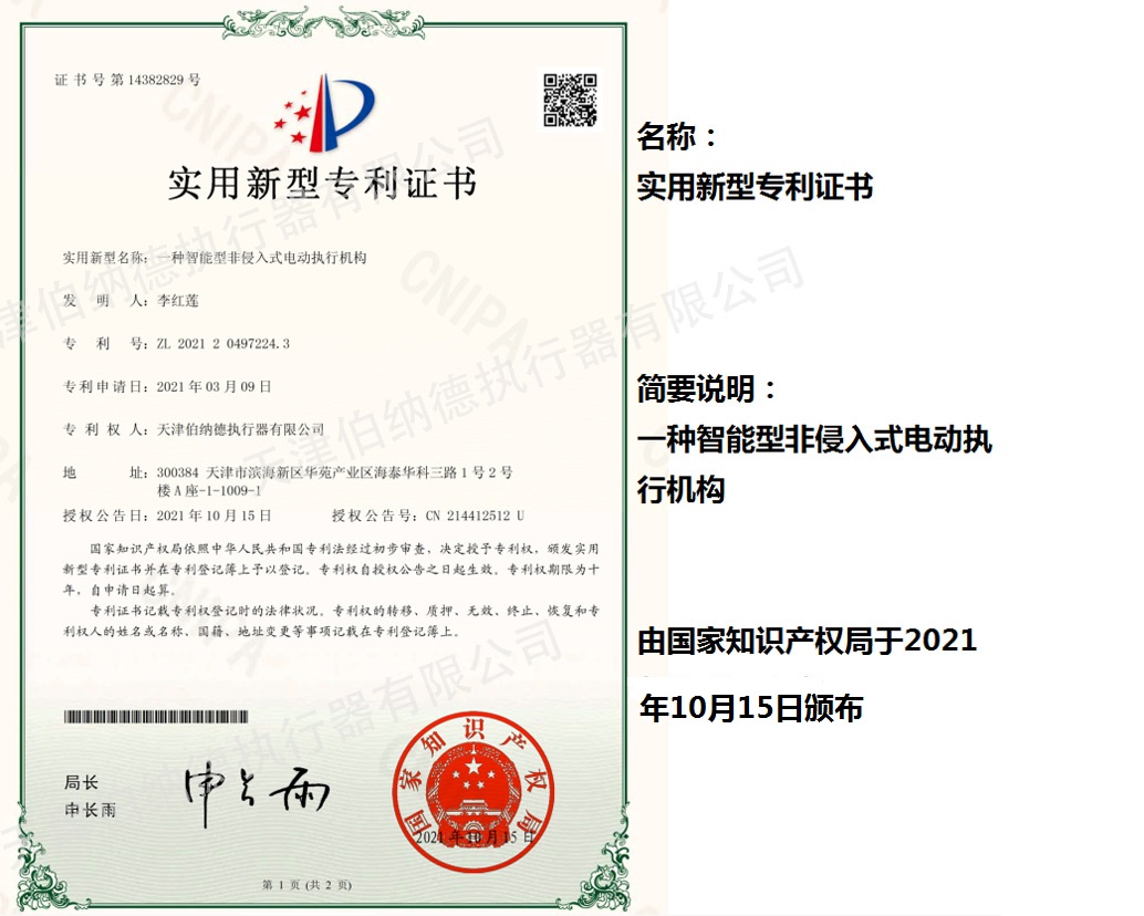 天津伯納德執行器有限公司(以下簡稱天津伯納德)位于高新產業園區—華苑產業園區,是受國家扶持的高新技術企業,連續9年獲得了“國家高新技術企業證書”,并且獲得了“天津市市級高新技術企業證書”和“國家科技型中小企業”、“天津市科技型中小企業認證證書”等榮譽稱號。 天津伯納德擁有技術人才和管理人才,是集智能型電動執行機構的研究開發、生產制造、銷售、安裝調試于一體的公司。天津伯納德堅持質量管理,不斷完善質量管理體系確保產品質量,提供售前售后服務,榮獲“ISO9001:2015質量管理體系認證證書”,歐盟市場認證產品的“C E認證證書”,及俄羅斯認證產品的“E A C認證證書”。 天津伯納德主要生產的產品類型有:SD 系列電動執行器、IQ系列電動執行器、DKJ系列電動執行器、QT系列電動裝置、DZW系列電動裝置、Q系列電動裝置、ISA系列電動裝置、ISQ系列電動裝置、BAZ系列電動裝置等智能型電動執行器及閥門電動操作器, 閥門伺服操作器,接線端子盒,現場控制箱,現場調試儀,球型鉸鏈,電動蝶閥,電動球閥,電動調節閥,配套電路板,配套模塊,配套閥門等多類型產品。產品種類豐富,生產技術成熟,滿足各行各業的執行器需求。 天津伯納德是生產電動執行機構的制造企業,擁有自身的專利和技術研發團隊,擁有過多項專利,榮獲“溫控式電動執行器實用新型專利證書”、“整體式電動閥門裝置實用新型專利證書”、“防爆型閥門電動裝置實用新型專利證書”、“智能型電動執行器實用新型專利證書”、“智能型電動調節閥實用新型專利證書”等專利證書。 天津伯納德生產的智能型電動執行機構,使用數字集成芯片,可選配全中文菜單操作和顯示、智能、人性化的機電一體的結構設計,免開蓋紅外線遙控器設定造就了其完善的功能、輕巧美觀、調試簡單、操作方便、中文菜單智能顯示簡單明了、可靠,充分保護,具有其完善的保護功能。